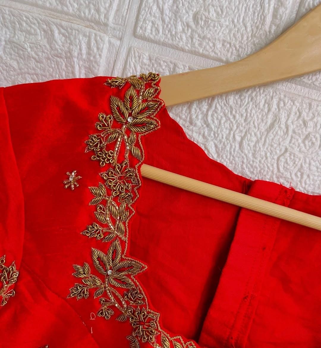 Make a statement on your special day with this exquisite Traditional Red Zardosi Wedding Blouse, intricately handcrafted to perfection. Designed to complement grand bridal ensembles, this blouse is adorned with fine zardosi embroidery, shimmering beads, and rich detailing that exude royalty.