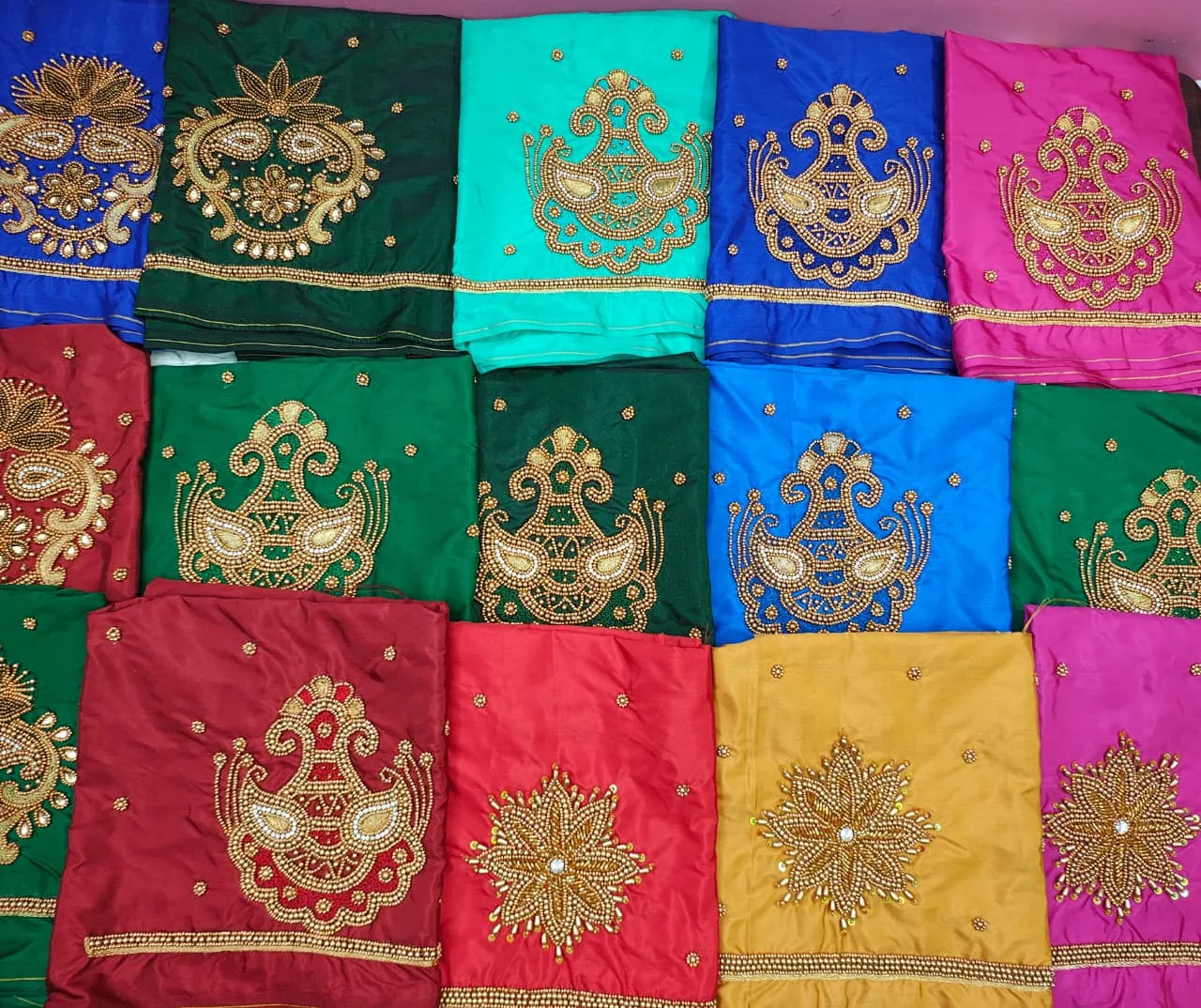 This blouse is crafted from Raw Silk and Cotton. It is available in sizes XL, XXL, and 3XL. Colors include Red, Pink, Green, Maroon, Wine, Yellow, Purple, and Brown. For more options, browse our collection.
