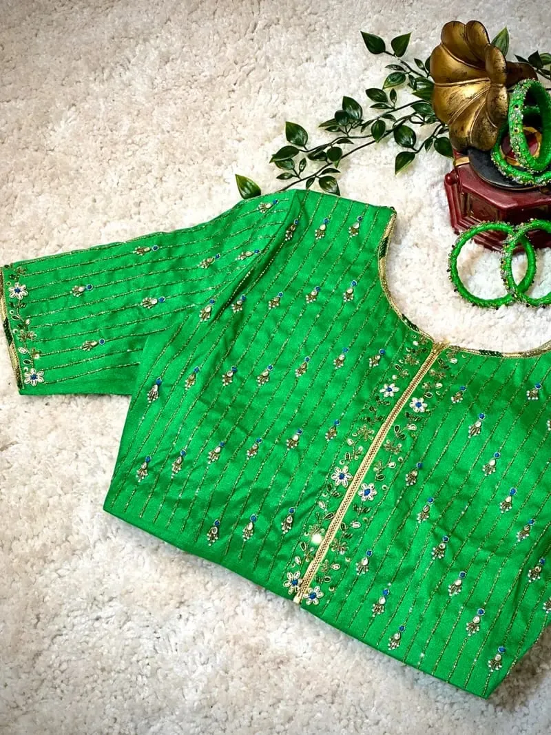 The Trending Green Maggam Work Blouse Design is crafted from luxurious half pattu fabric. Available colors include Red, Pink, Blue, Purple, and Wine. For more options, browse our collection today!
