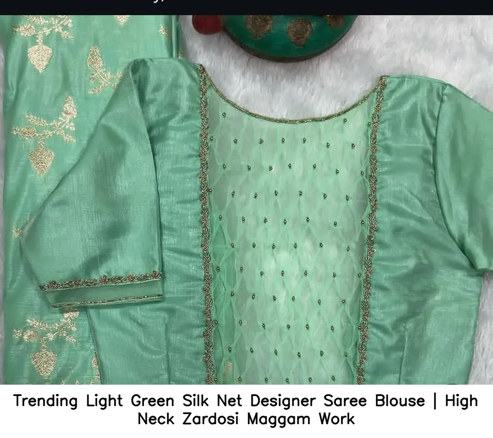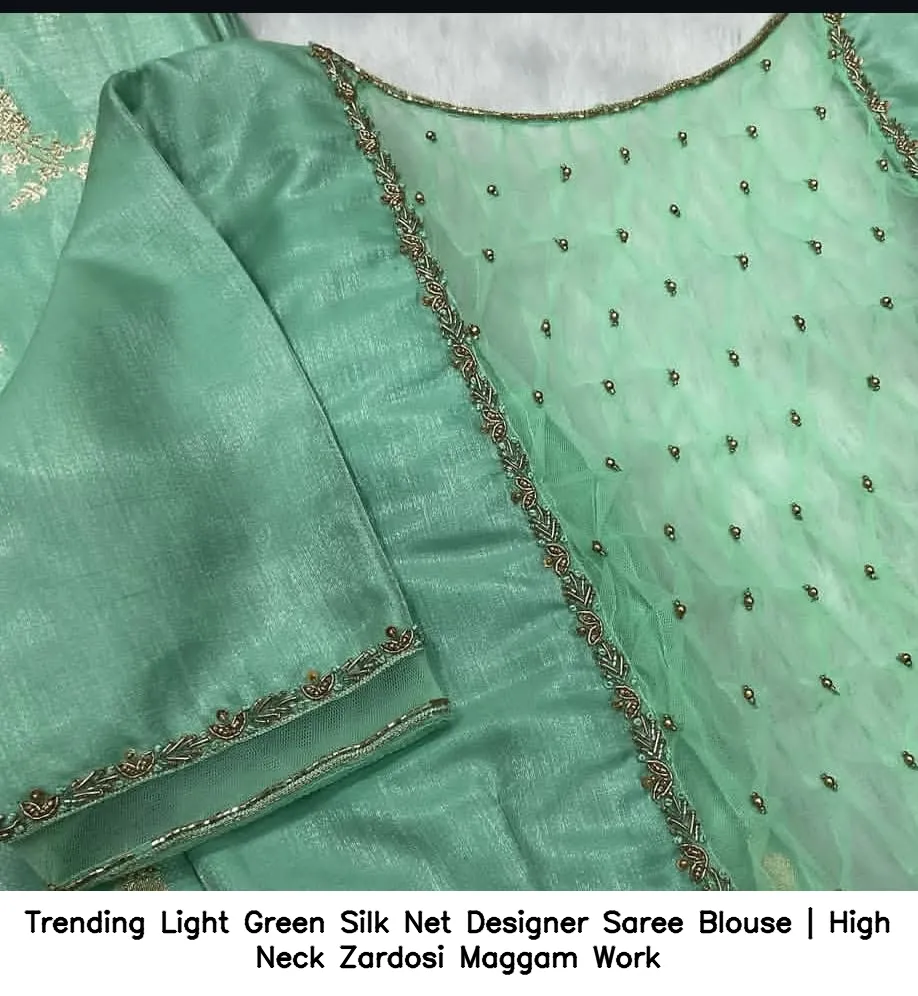 Trending Light Green Silk Net Designer Saree Blouse | High Neck Zardosi Maggam Work