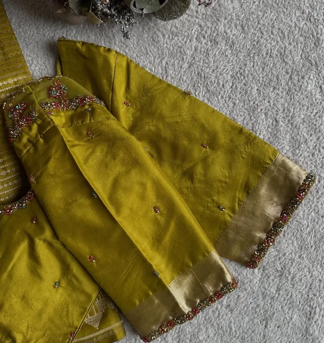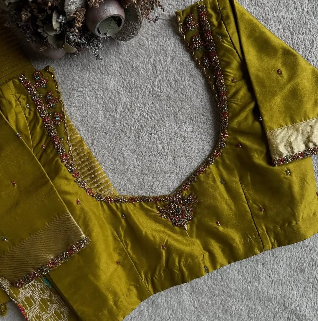 Stunning Green Raw Silk with Maggam Work blouse. Crafted for party wear, pairs beautifully with silk sarees and lehengas.