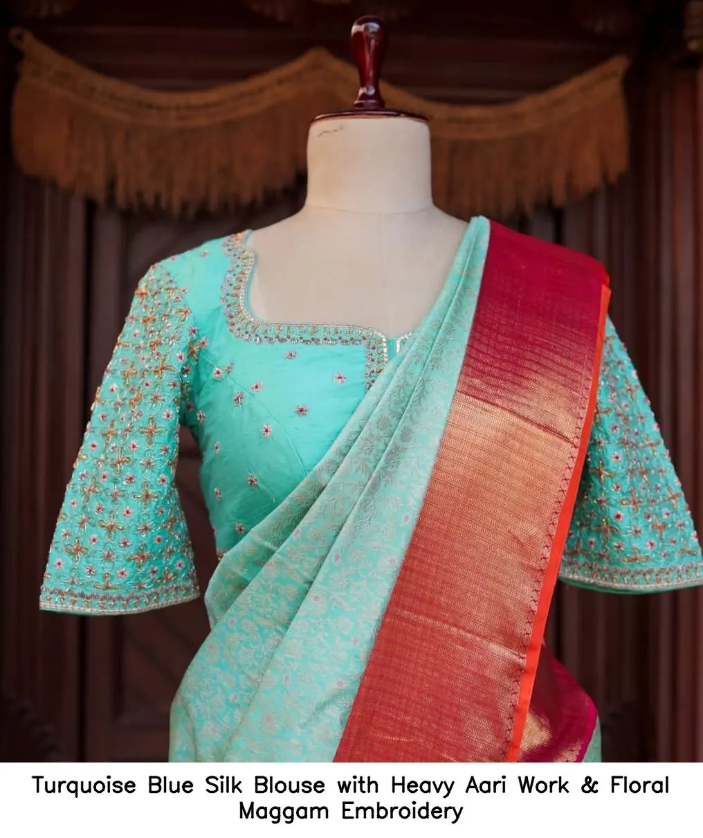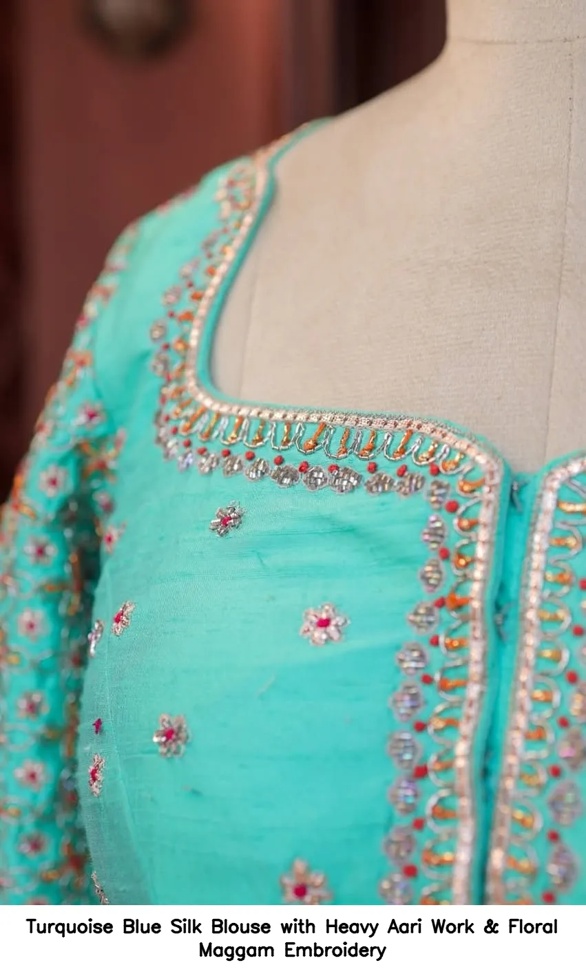 Turquoise Blue Silk Blouse with Heavy Aari Work & Floral Maggam Embroidery