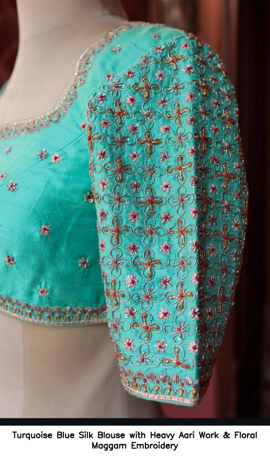 To maintain the beauty of your Turquoise Blue Silk Blouse with Heavy Aari Work & Floral Maggam Embroidery, hand wash in cold water. Avoid bleach and hang to dry. Iron on low heat to keep the embroidery intact.