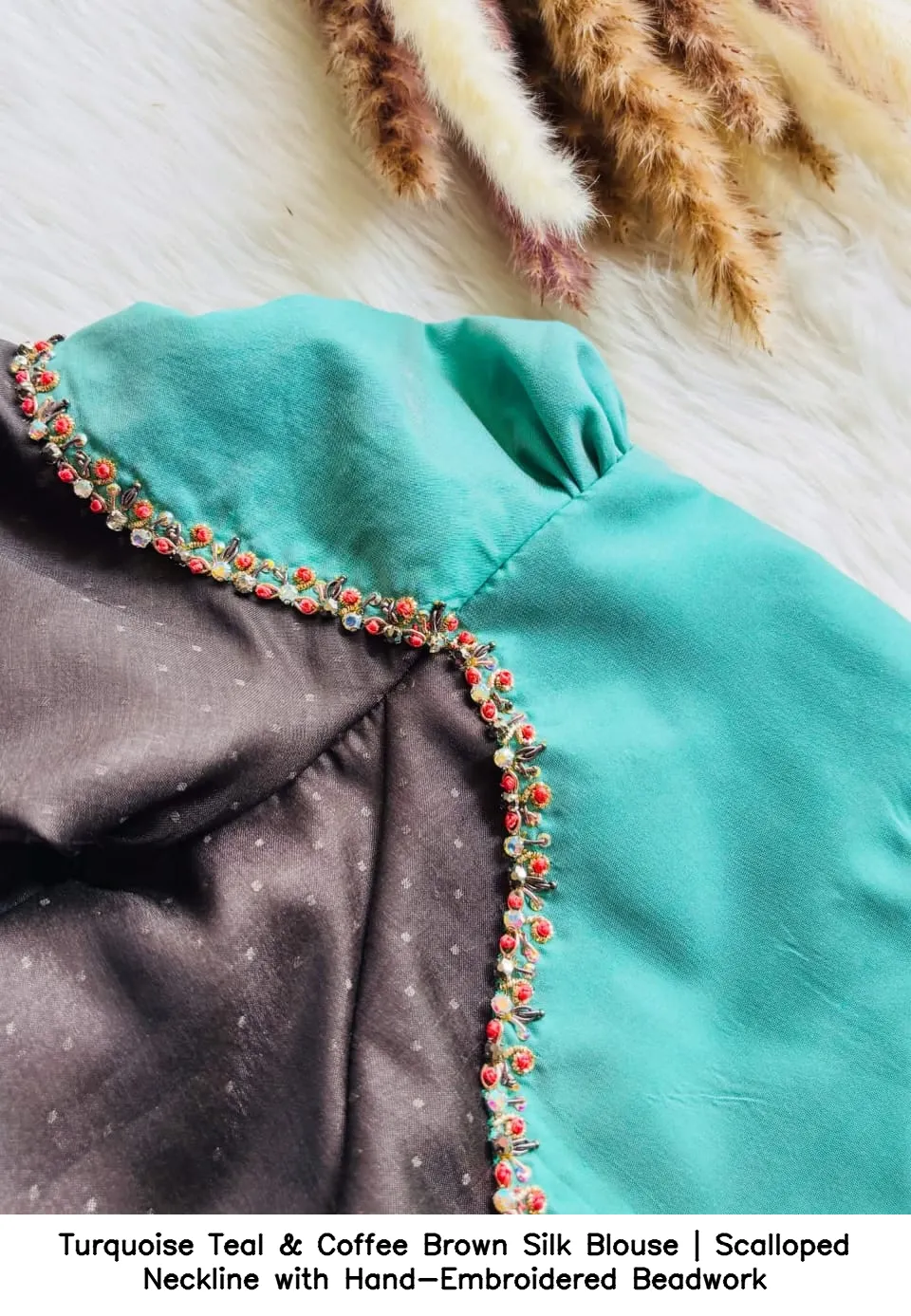 Turquoise Teal & Coffee Brown Silk Blouse | Scalloped Neckline with Hand-Embroidered Beadwork