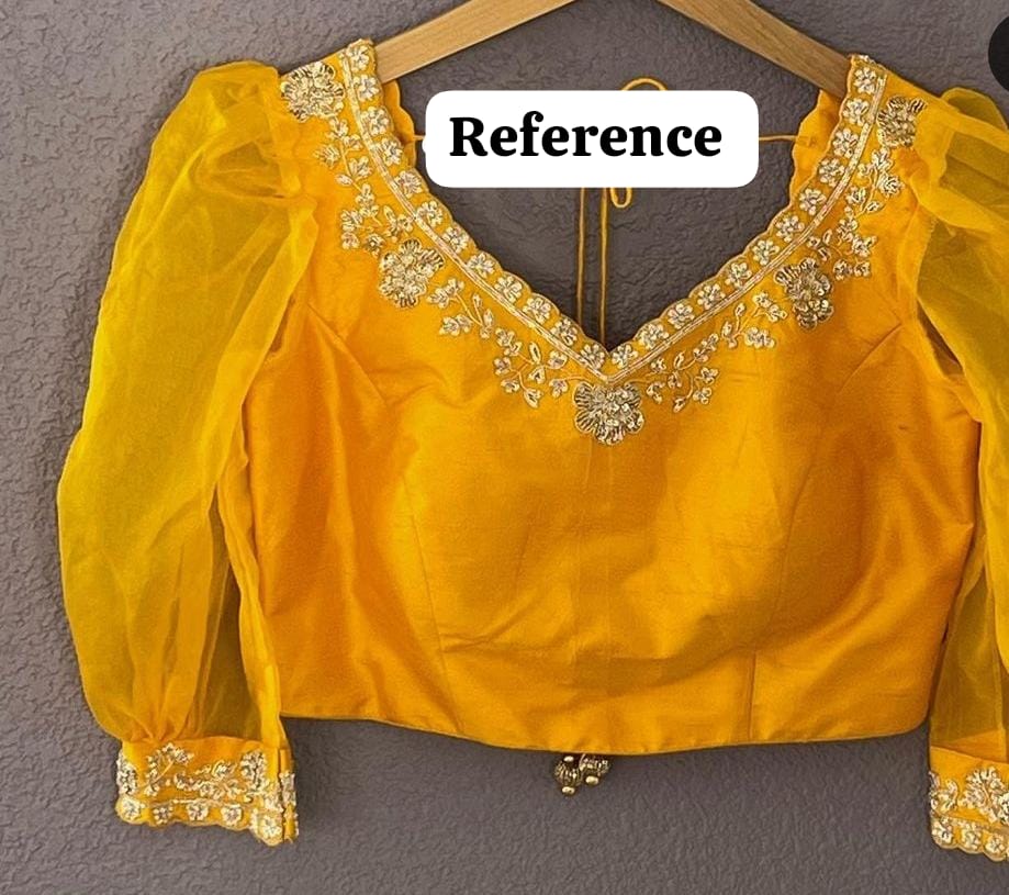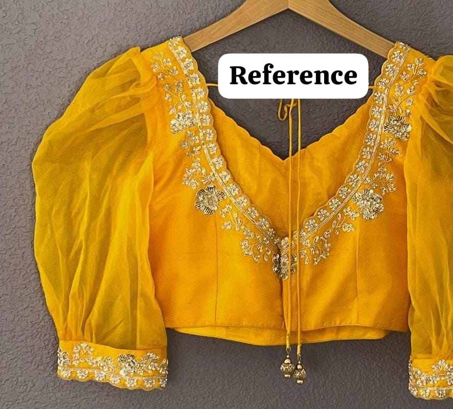 Order Notes: Make a captivating statement at every occasion with our V Neck Maggam Work Blouse. Specify your preferred size during the order placement process and embrace the elegance and traditional charm that this blouse brings to your collection. Express your individuality with a piece that seamlessly blends modern style with timeless craftsmanship.