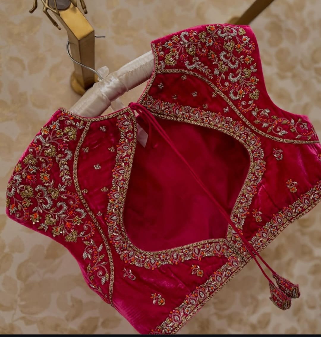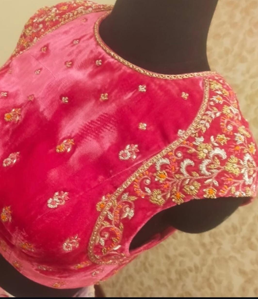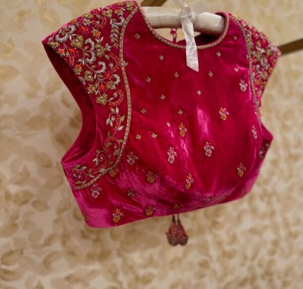 Step into luxury with the Velvet Bloom blouse, a masterpiece crafted for modern elegance and timeless charm. The rich pink velvet fabric combined with a sophisticated high neck design creates a stunning statement piece that’s perfect for weddings, receptions, and festive celebrations.