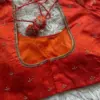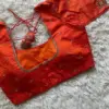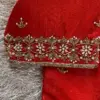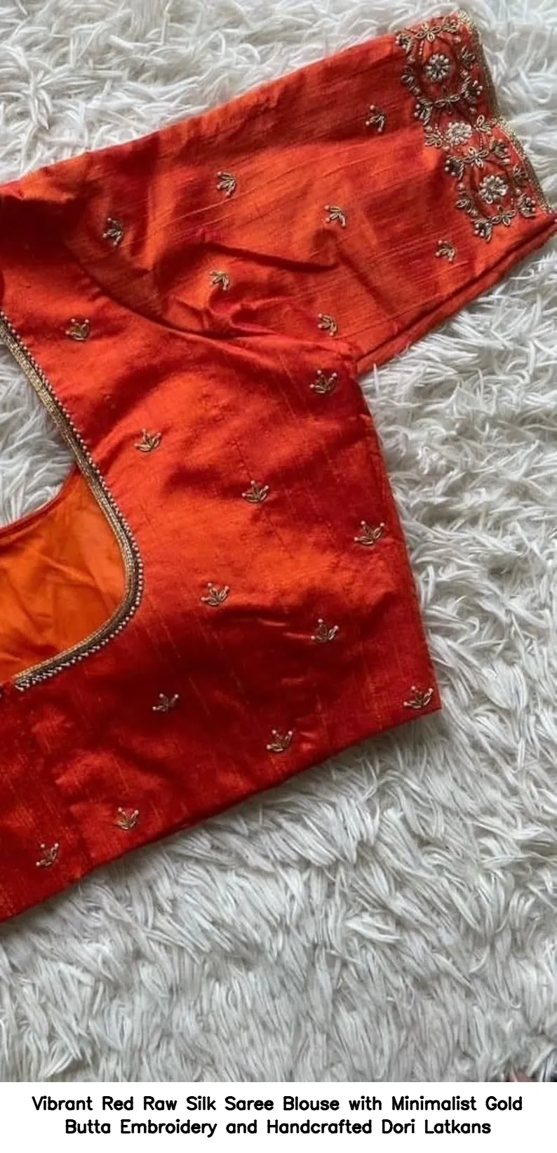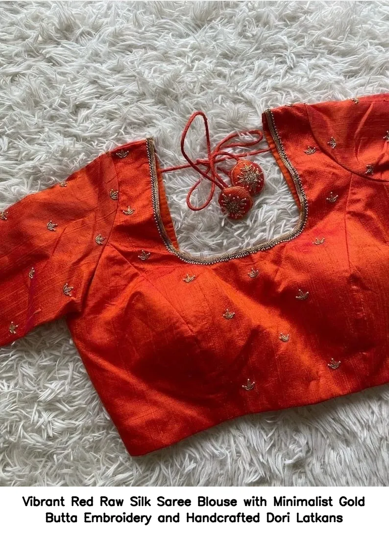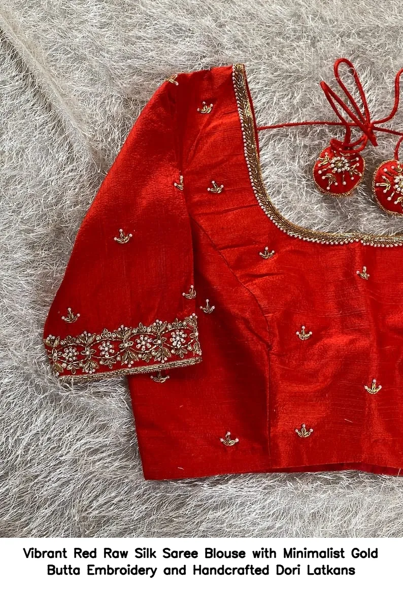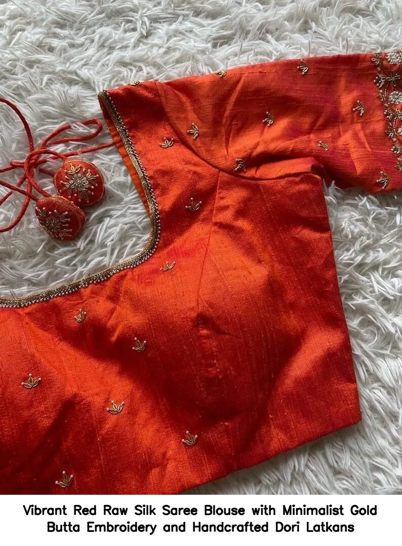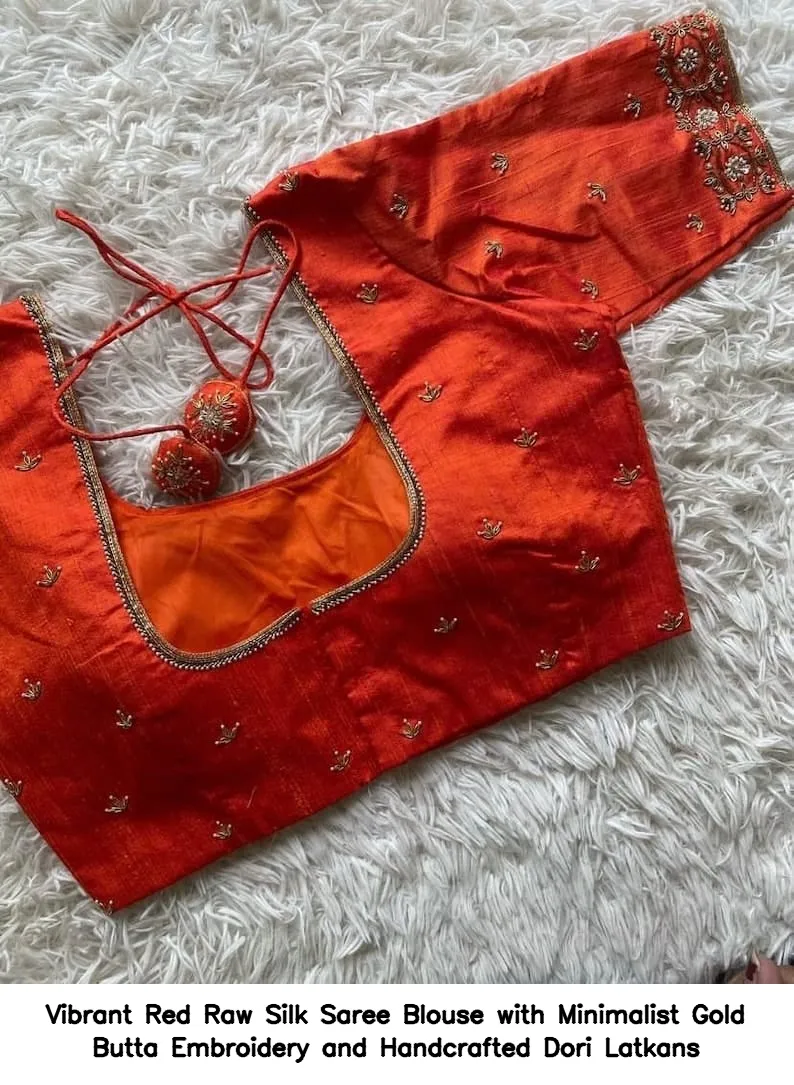 Vibrant Red Raw Silk Saree Blouse with Minimalist Gold Butta Embroidery and Handcrafted Dori Latkans