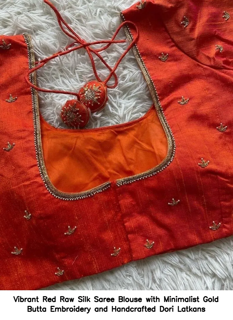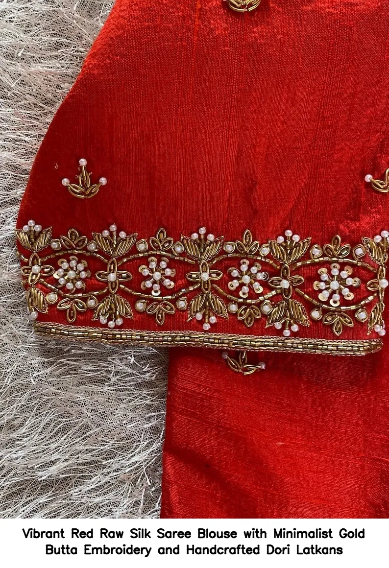 Product Name: Vibrant Red Raw Silk Saree Blouse with Minimalist Gold Butta Embroidery and Handcrafted Dori Latkans