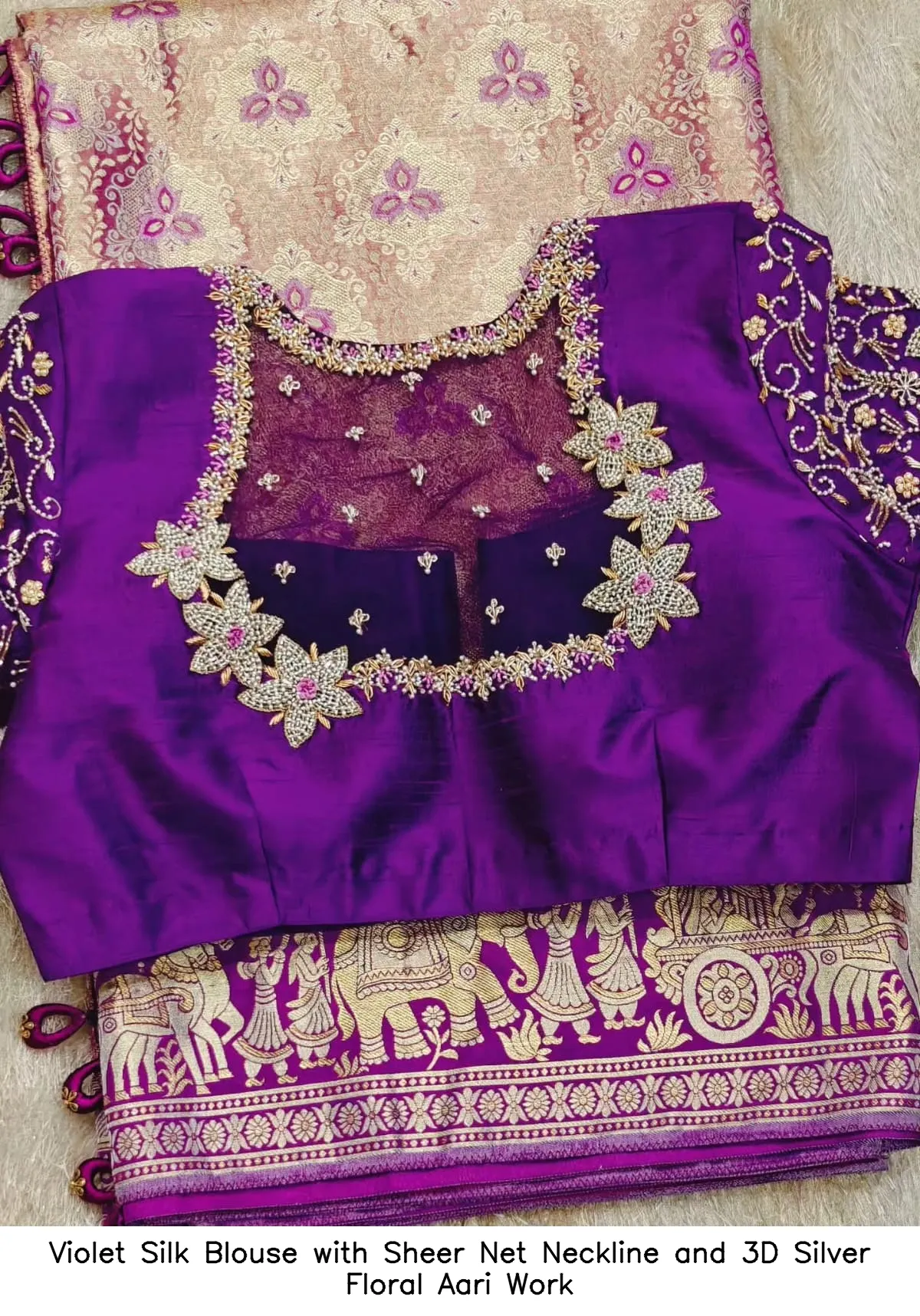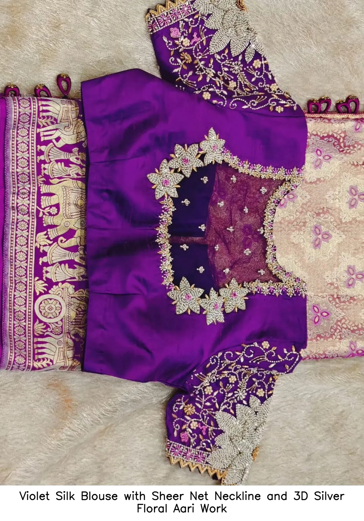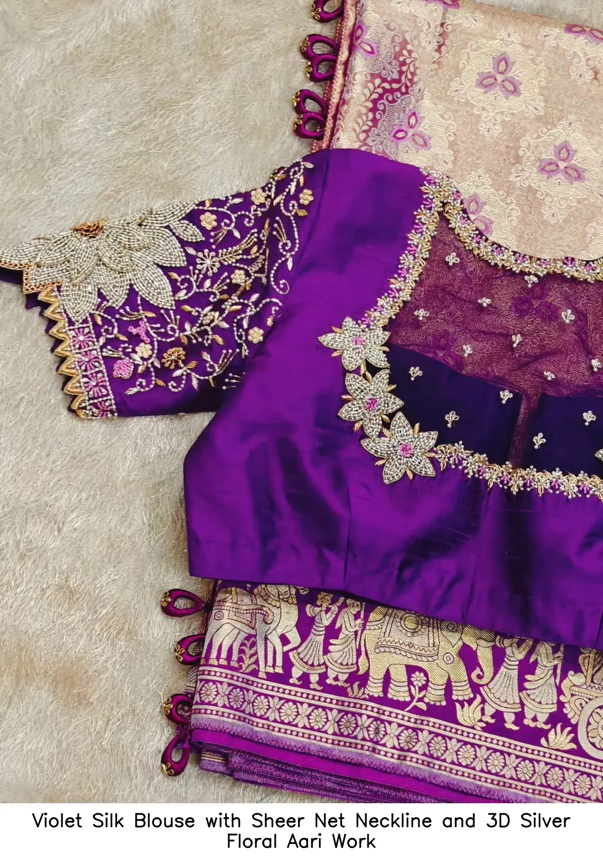 Why Choose the Violet Silk Blouse with Sheer Net Neckline and 3D Silver Floral Aari Work?