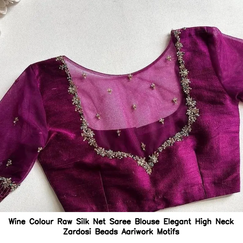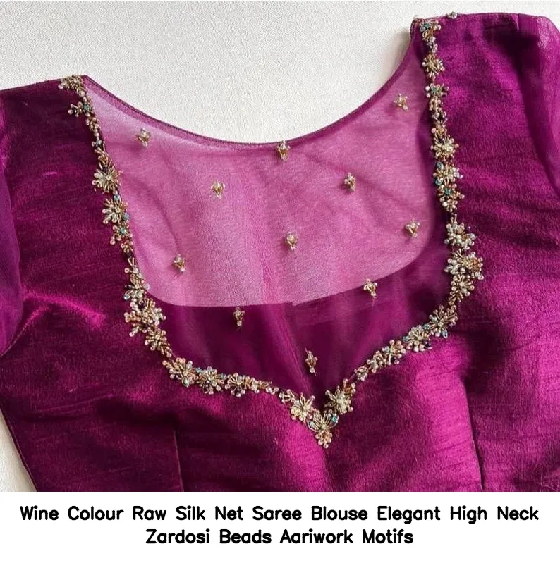 Wine Colour Raw Silk Net Saree Blouse Elegant High Neck Zardosi Beads Aariwork Motifs is a must-have for your ethnic collection. Follow us on Facebook for the latest updates and fashion tips!