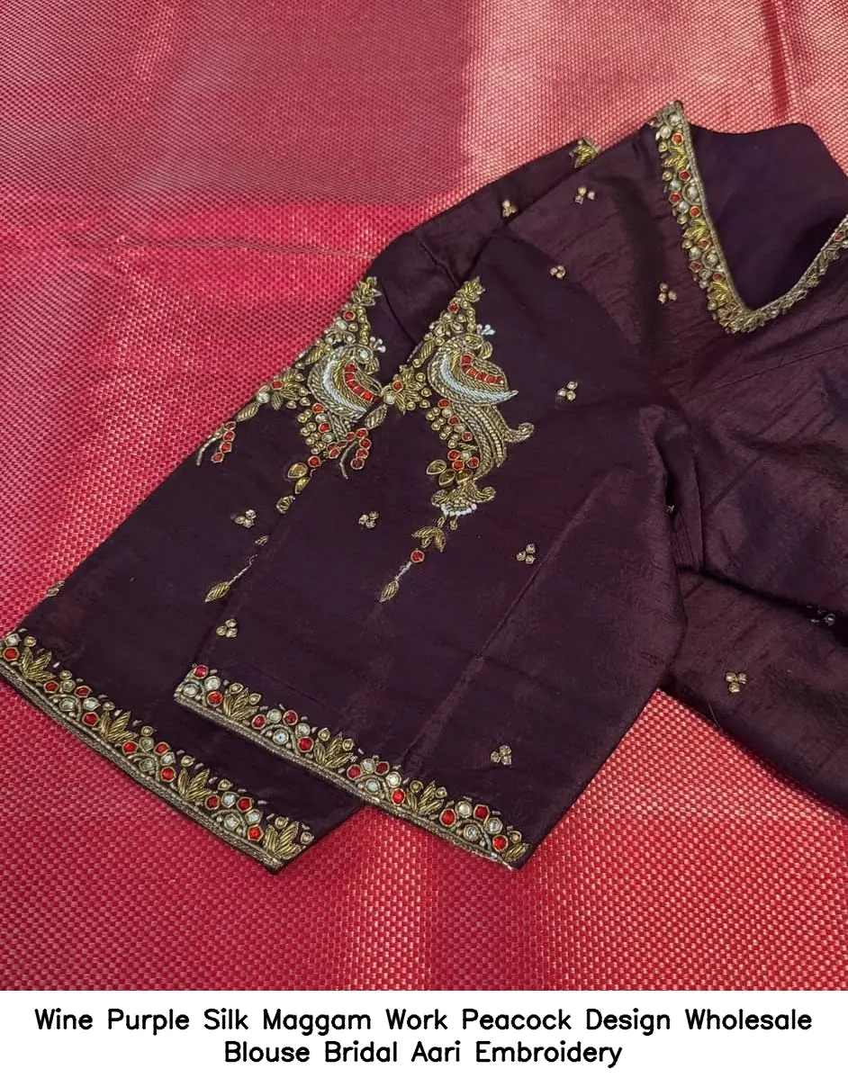 To maintain the beauty of the Wine Purple Silk Maggam Work Peacock Design Wholesale Blouse – Bridal Aari Embroidery, hand wash it in cold water. Avoid using harsh detergents and store it in a cool, dry place.