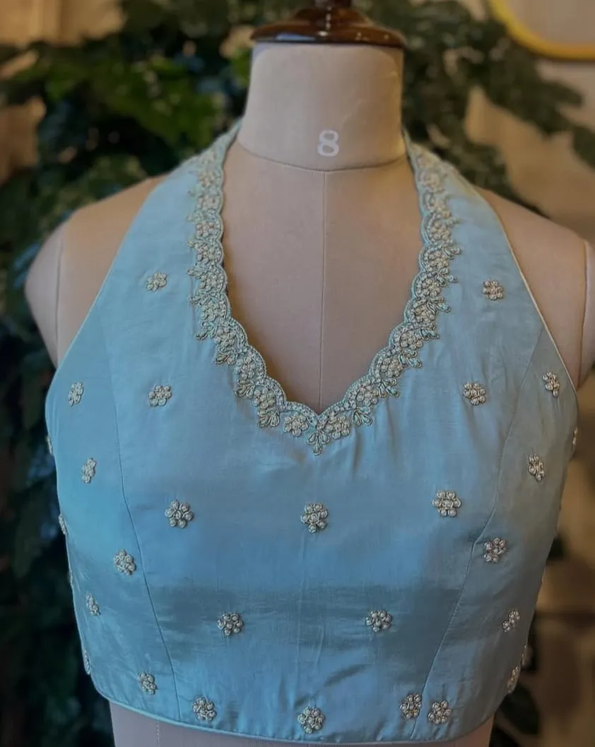 Exquisite Pastel Blue Halter Neck Blouse with Maggam Work Custom Sizes Available