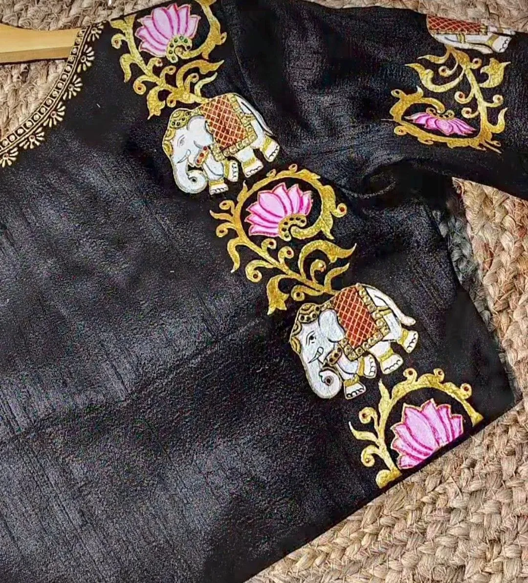 Black Tanjore Elephant Maggam Work Blouse Custom-Made Elegance offers a unique blend of tradition and style. This exquisite blouse enhances your ethnic wardrobe. Moreover, it is perfect for festive occasions or special gatherings.