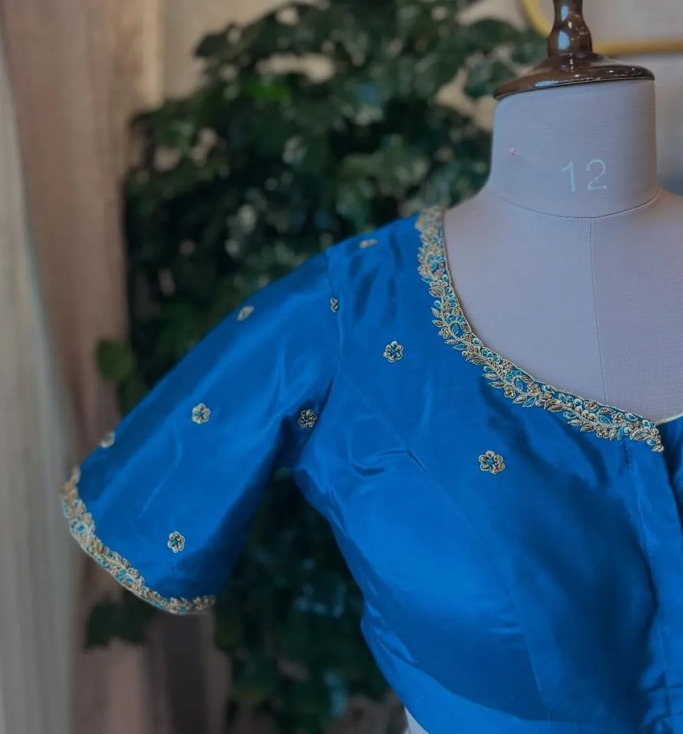 Product Name: Trendy Blue High Neck Maggam Work Blouse Exclusive Handcrafted Design Under Budget